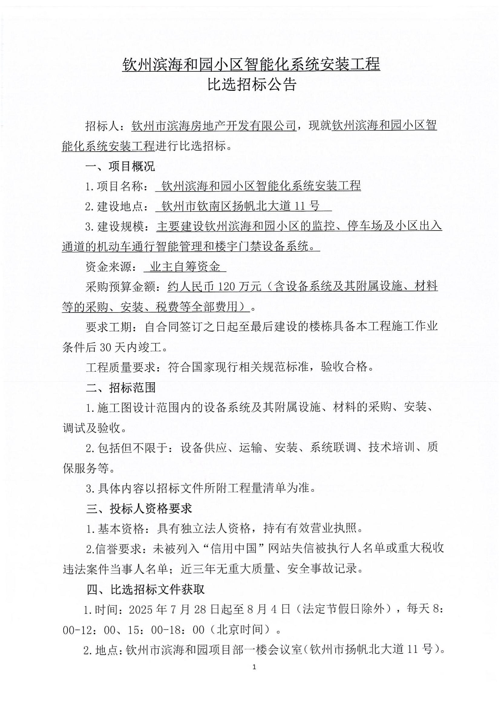 欽州濱海和園小區(qū)智能化系統(tǒng)安裝工程比選招標(biāo)公告