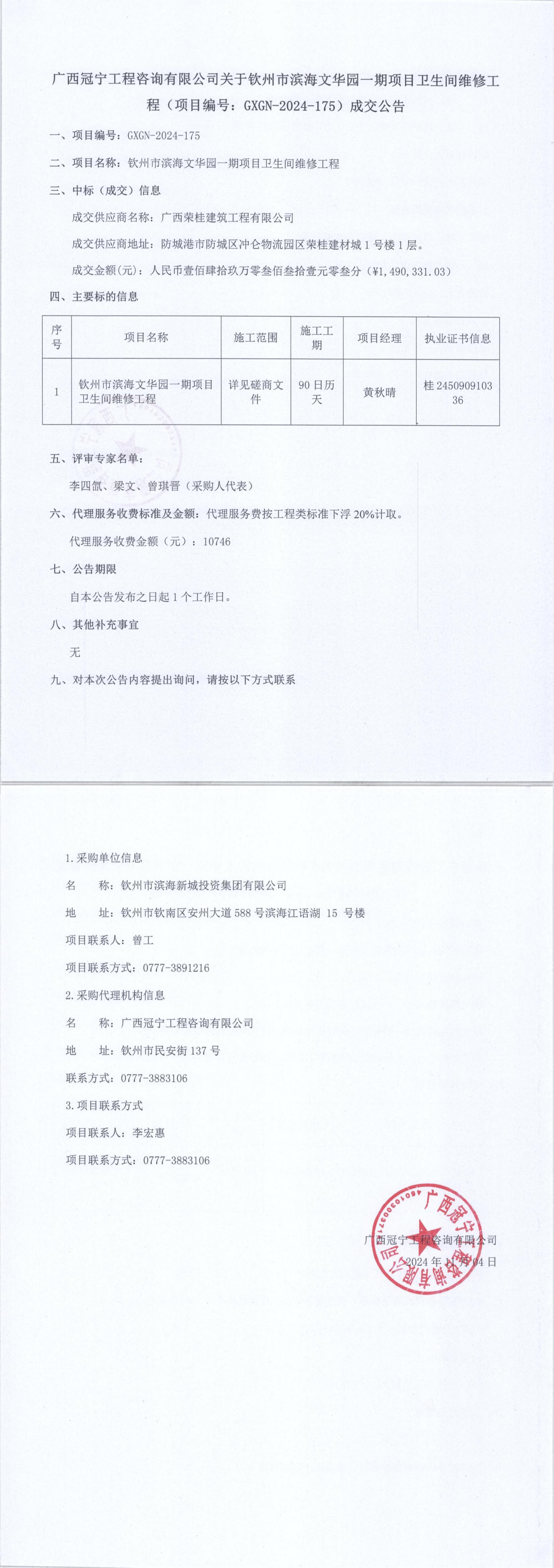 廣西冠寧工程咨詢有限公司關(guān)于欽州市濱海文華園一期項目衛(wèi)生間維修工程(項目編號:GXGN-2024-175)成交公告