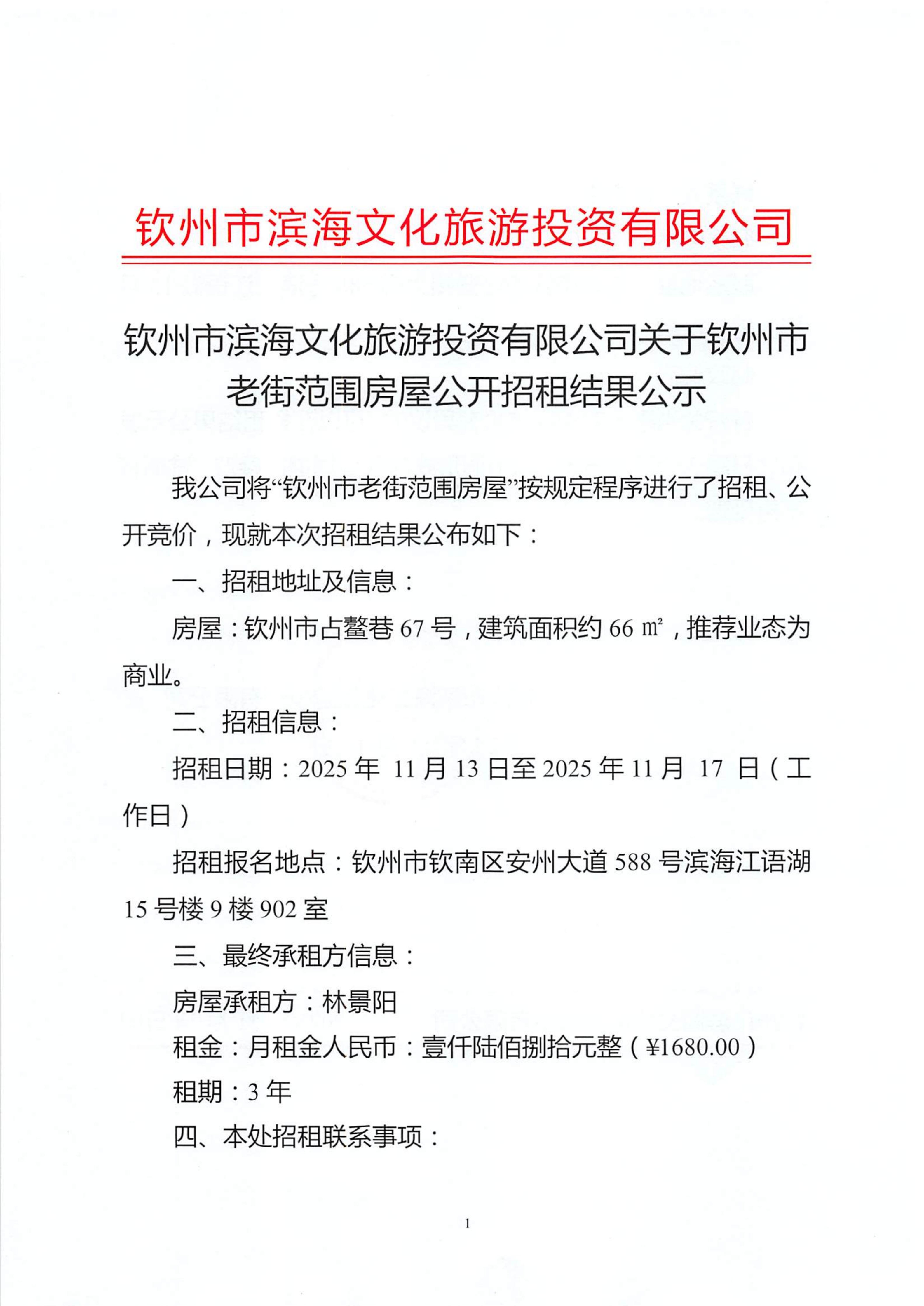 關于欽州市老街范圍房屋公開招租結果公示(欽州市占鰲巷67號)