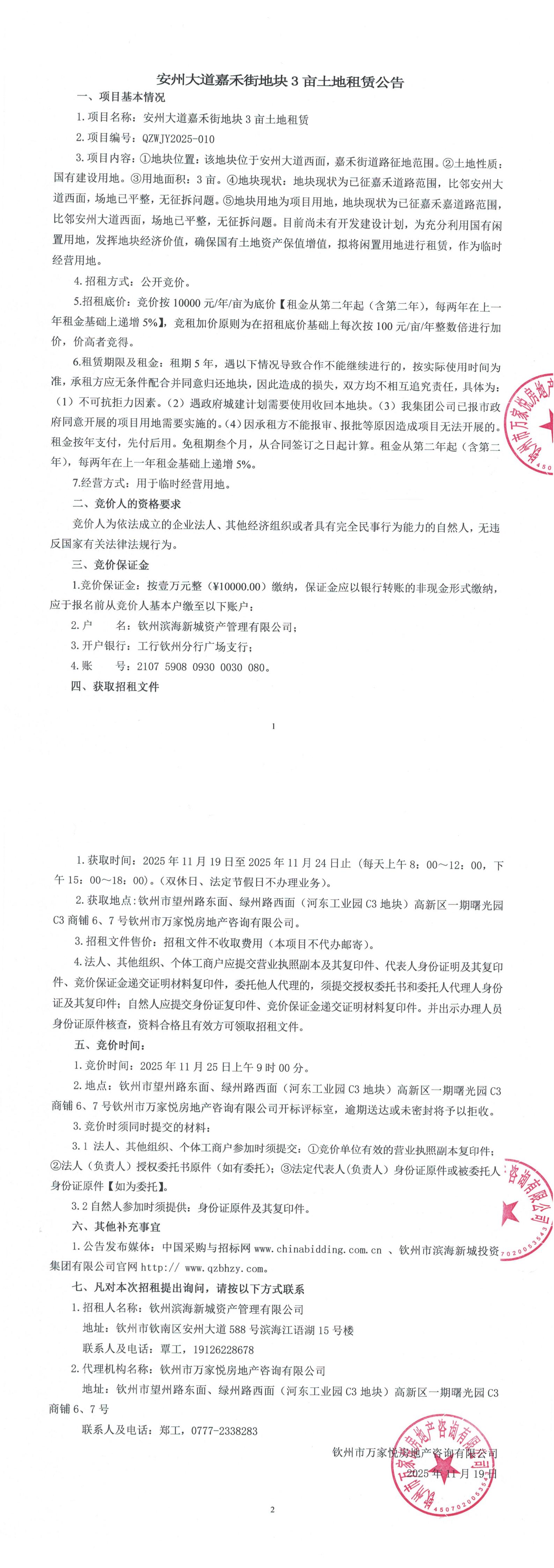 北部灣大學西門28畝土地作為經(jīng)營場地租賃(QZWJY2025-009)成交結果公告