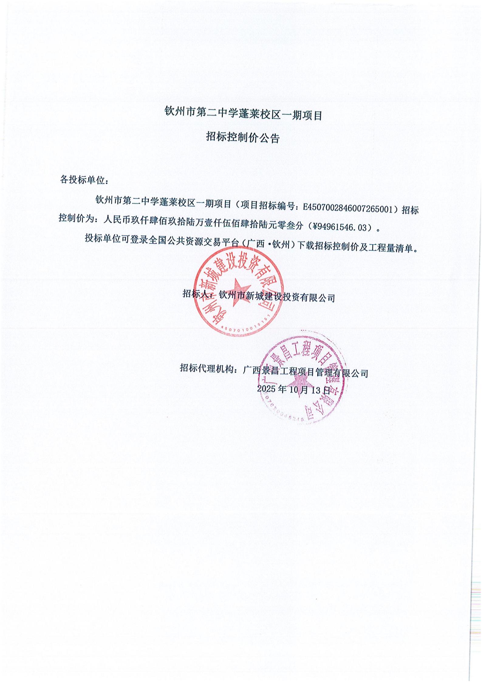 欽州市第二中學(xué)蓬萊校區(qū)一期項(xiàng)目招標(biāo)控制價公告