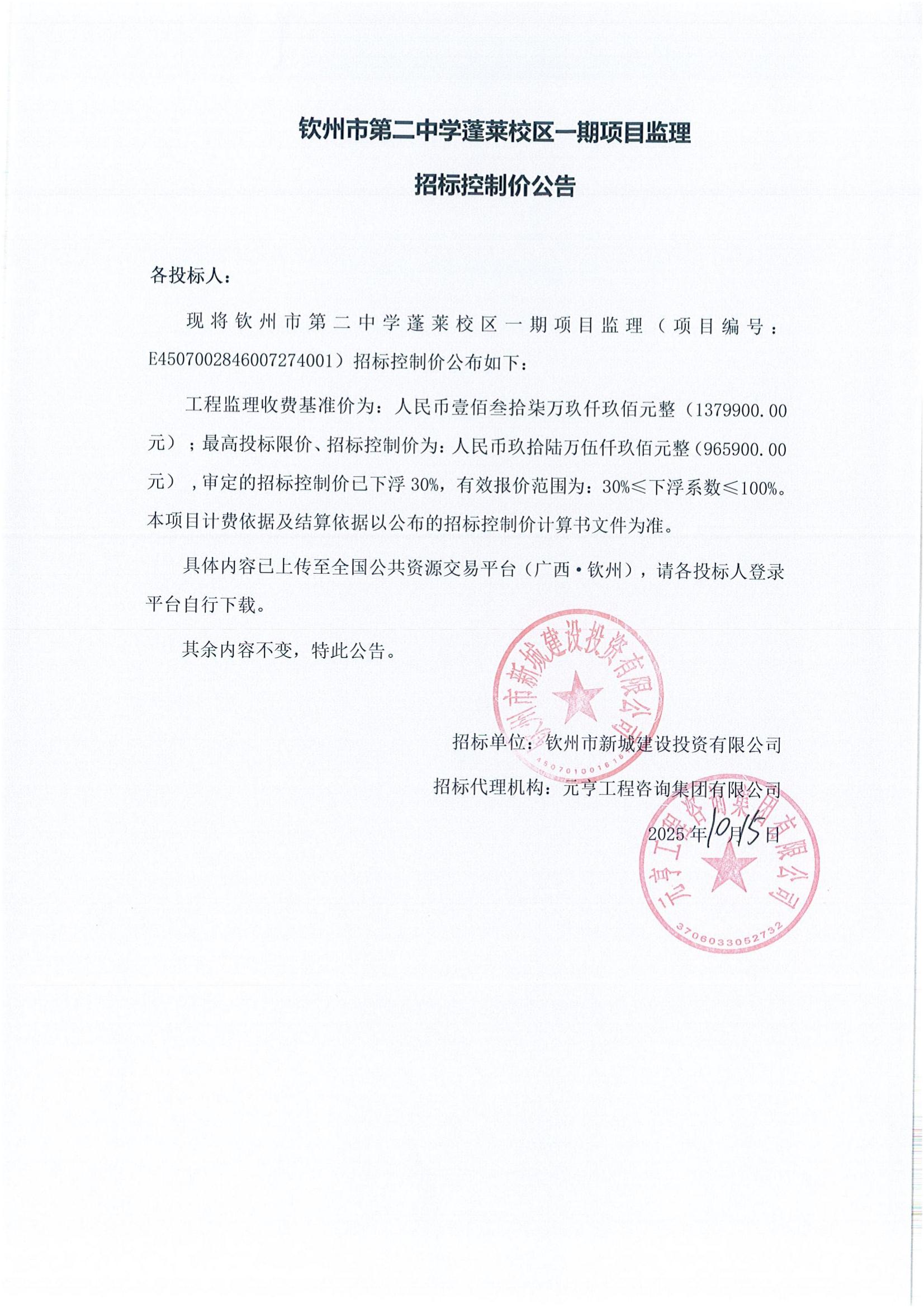 欽州市第二中學(xué)蓬萊校區(qū)一期項(xiàng)目監(jiān)理招標(biāo)控制價公告