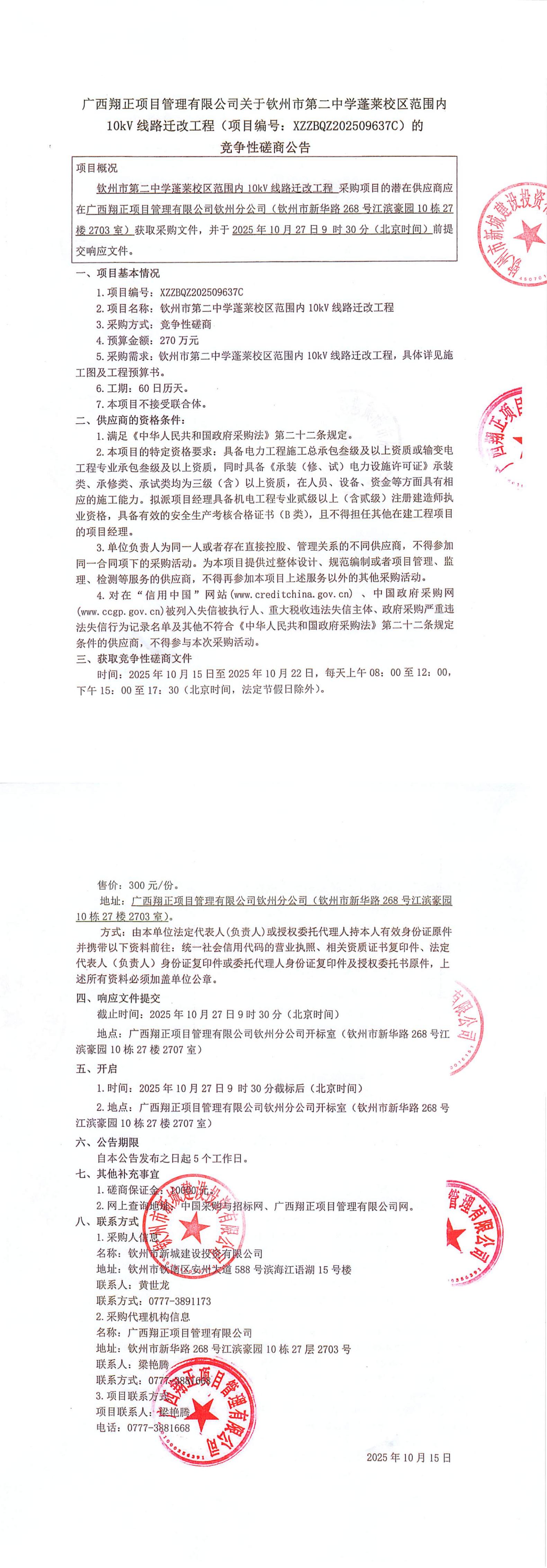 廣西翔正項(xiàng)目管理有限公司關(guān)于欽州市第二中學(xué)蓬萊校區(qū)范圍內(nèi)10kV線路遷改工程(項(xiàng)目編號:XZZBQZ202509637C)的競爭性磋商公告