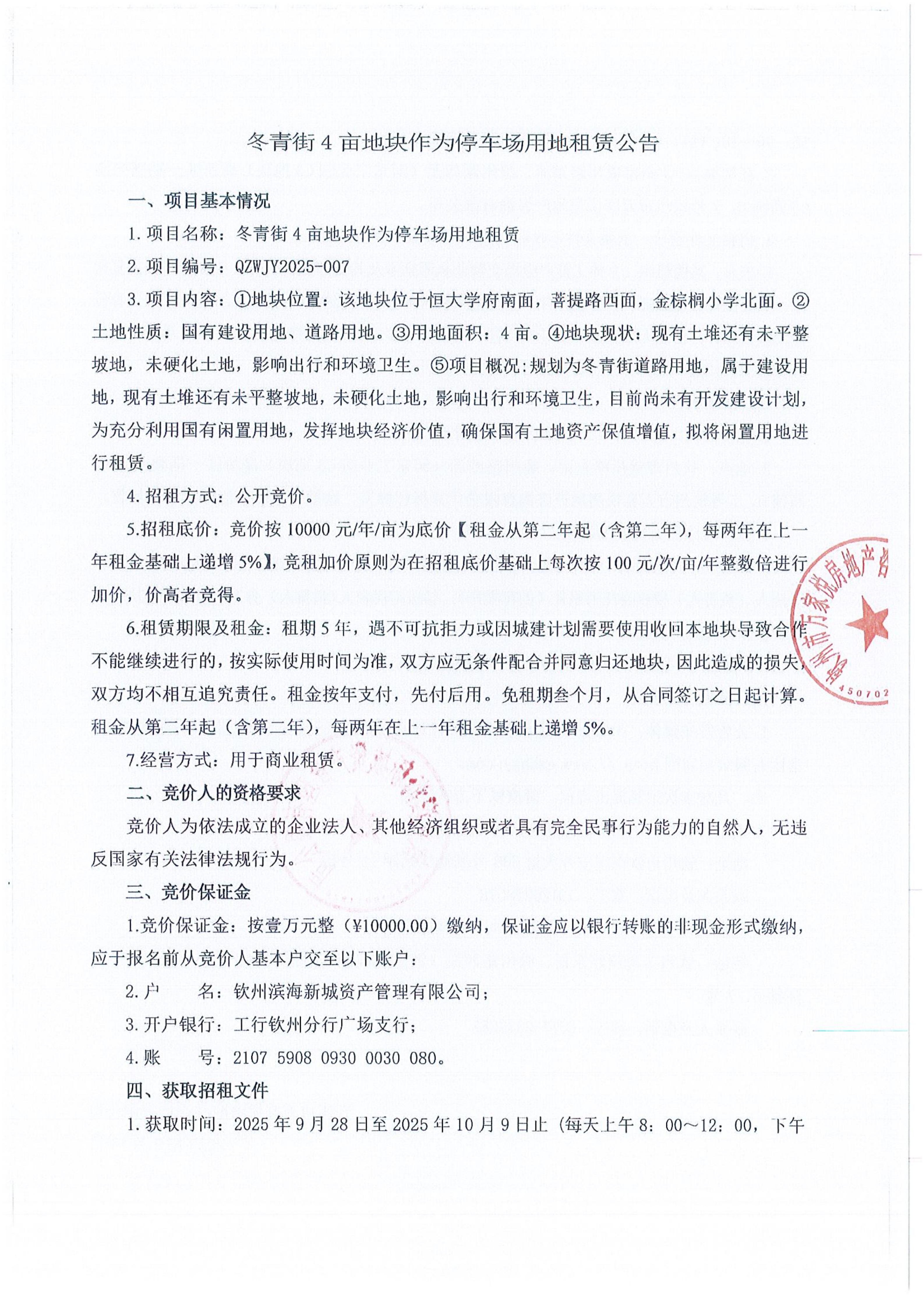 冬青街4畝地塊作為停車(chē)場(chǎng)用地租賃公告