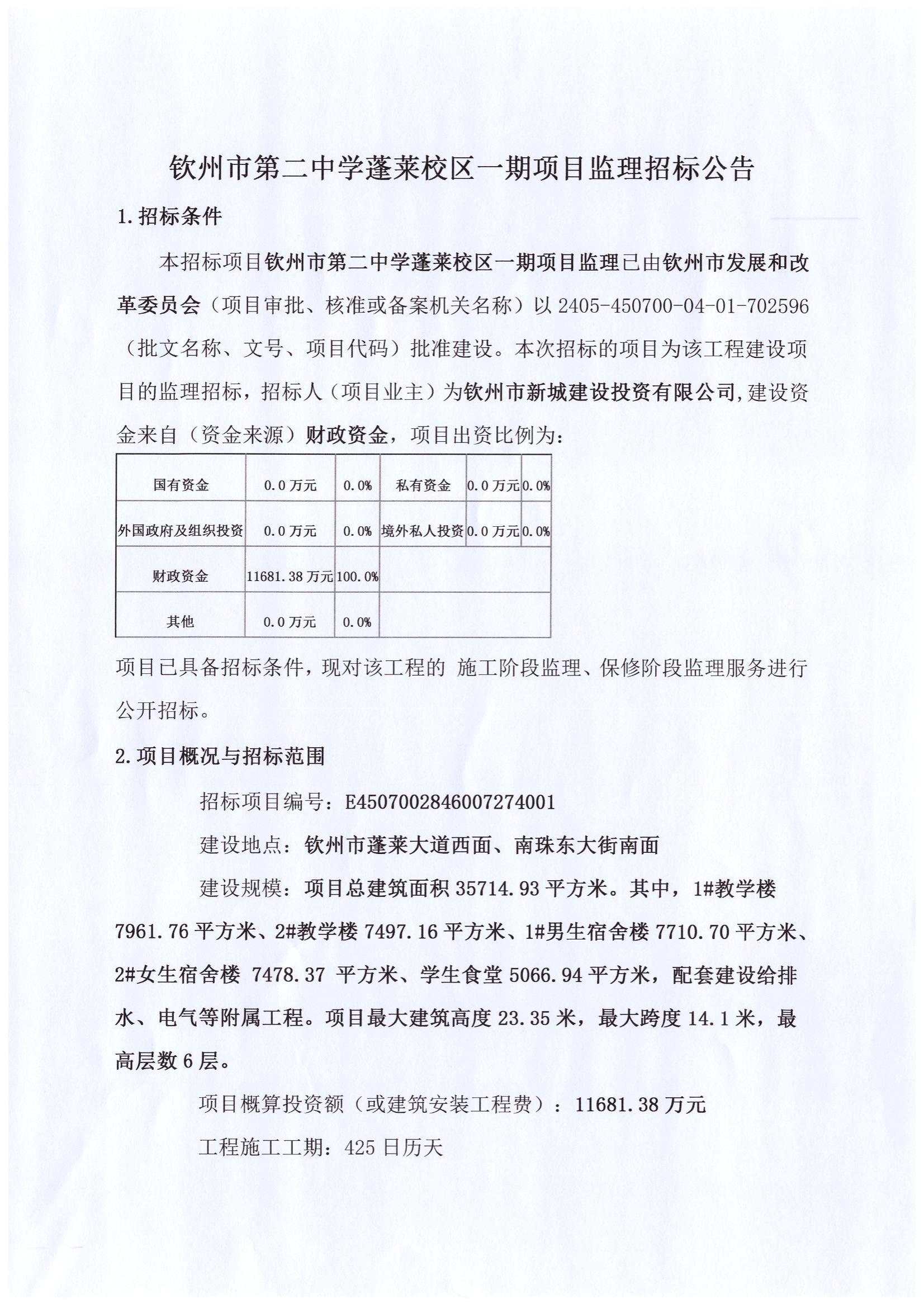 欽州市第二中學(xué)蓬萊校區(qū)一期項(xiàng)目監(jiān)理招標(biāo)公告