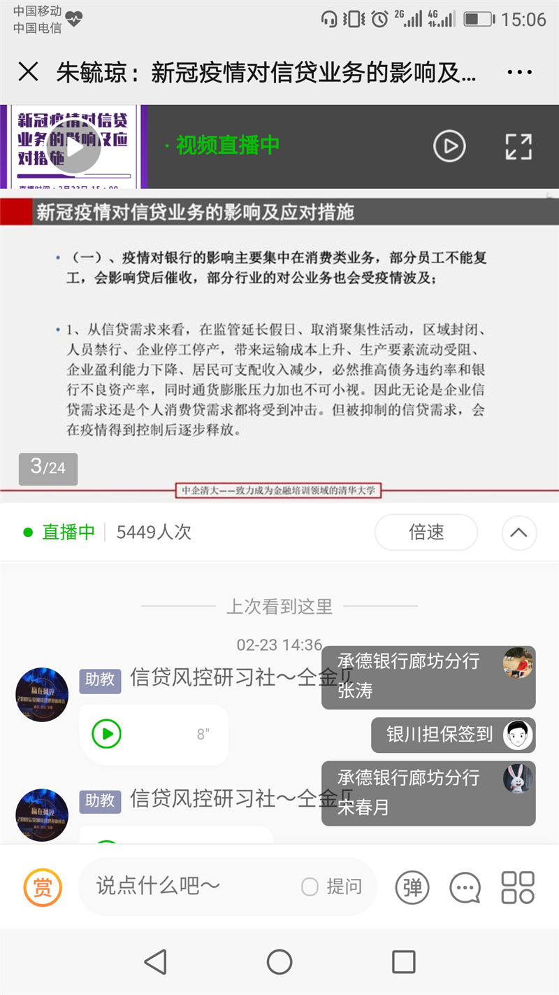 2020年2月23日下午,我公司員工集體參加銀行信貸風險專家朱毓瓊老師主講的“新冠疫情對信貸業(yè)務的影響及應對措施”專題網(wǎng)課。通過本次網(wǎng)課培訓,系統(tǒng)地學習了解新冠疫情對融資擔保行業(yè)的影響,充分認識本次新型冠狀病毒肺炎疫情對融資擔保行業(yè)的影響和沖擊,以及學習各地監(jiān)管部門的最新政策和應對措施。