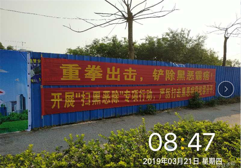為抓好此項(xiàng)工作,通知各項(xiàng)目代表深入現(xiàn)場,并召集施工單位召開了專題動員會,并制定了具體的工作措施,如:張掛橫幅、微信群、qq群等渠道宣傳掃黑除惡行動。做到每個(gè)項(xiàng)目現(xiàn)場都在明顯位置張掛掃黑除惡標(biāo)語的橫幅。