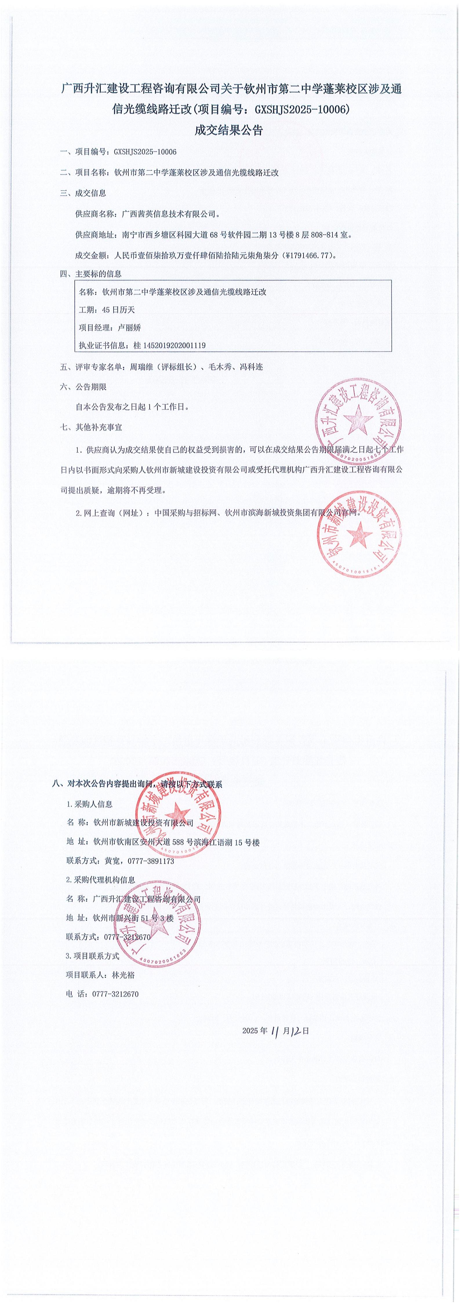 關(guān)于欽州市第二中學(xué)蓬萊校區(qū)涉及通信光纜線路遷改(項(xiàng)目編號(hào):GXSHJS2025-10006) 成交結(jié)果公告