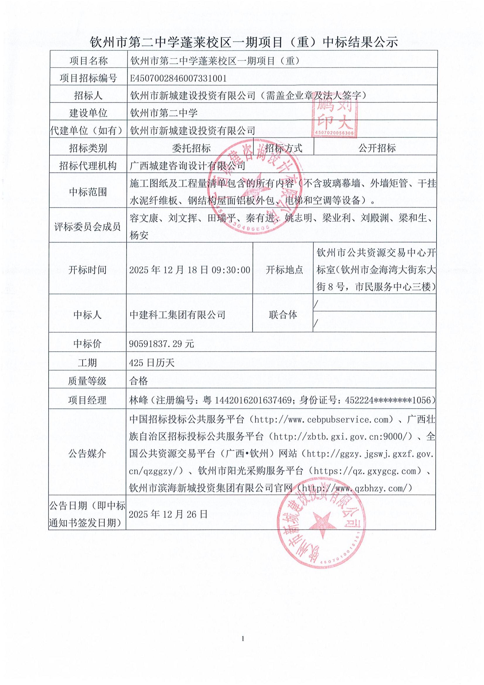 欽州市第二中學蓬萊校區(qū)一期項目(重)中標結(jié)果公示