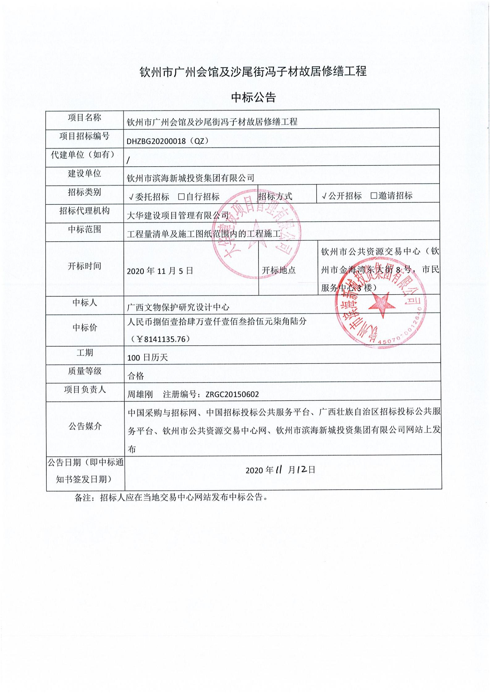 欽州市廣州會館及沙尾街馮子材故居修繕工程中標(biāo)公告