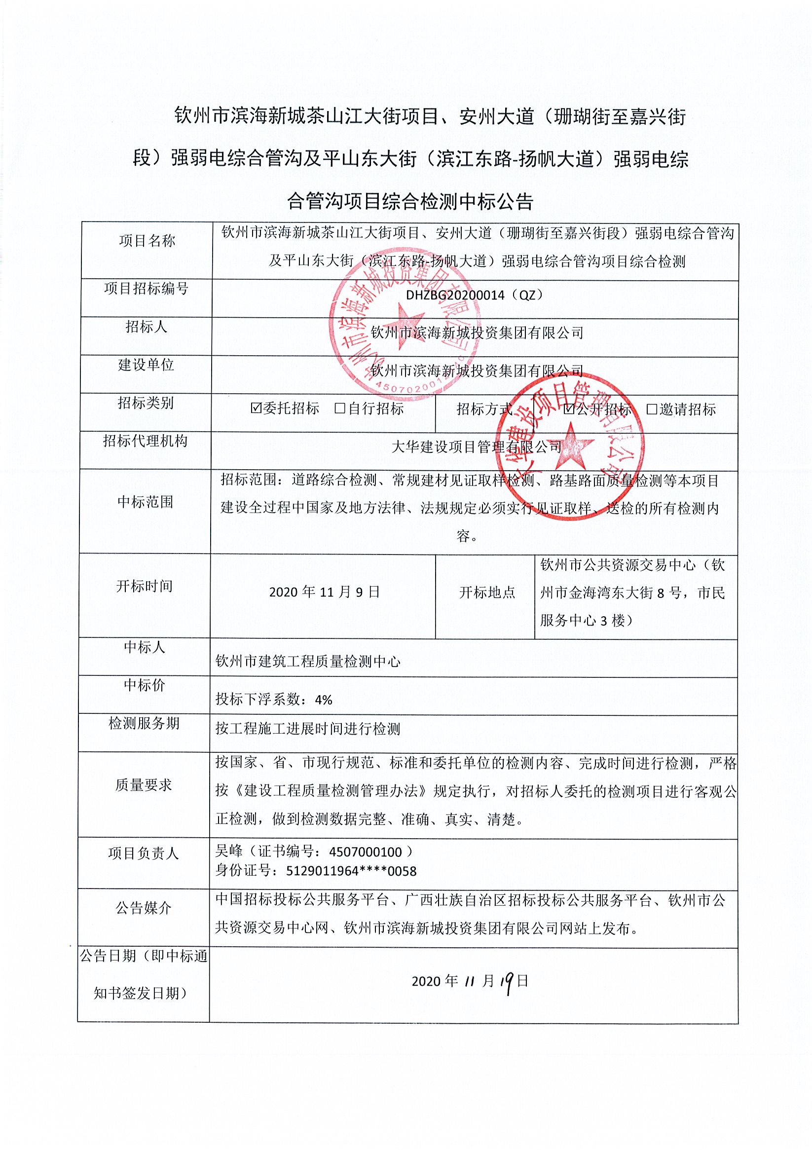 欽州市濱海新城茶山江大街項(xiàng)目、安州大道(珊瑚街至嘉興街段)強(qiáng)弱電綜合管溝及平山東大街(濱江東路-揚(yáng)帆大道)強(qiáng)弱電綜合管溝項(xiàng)目綜合檢測中標(biāo)公告