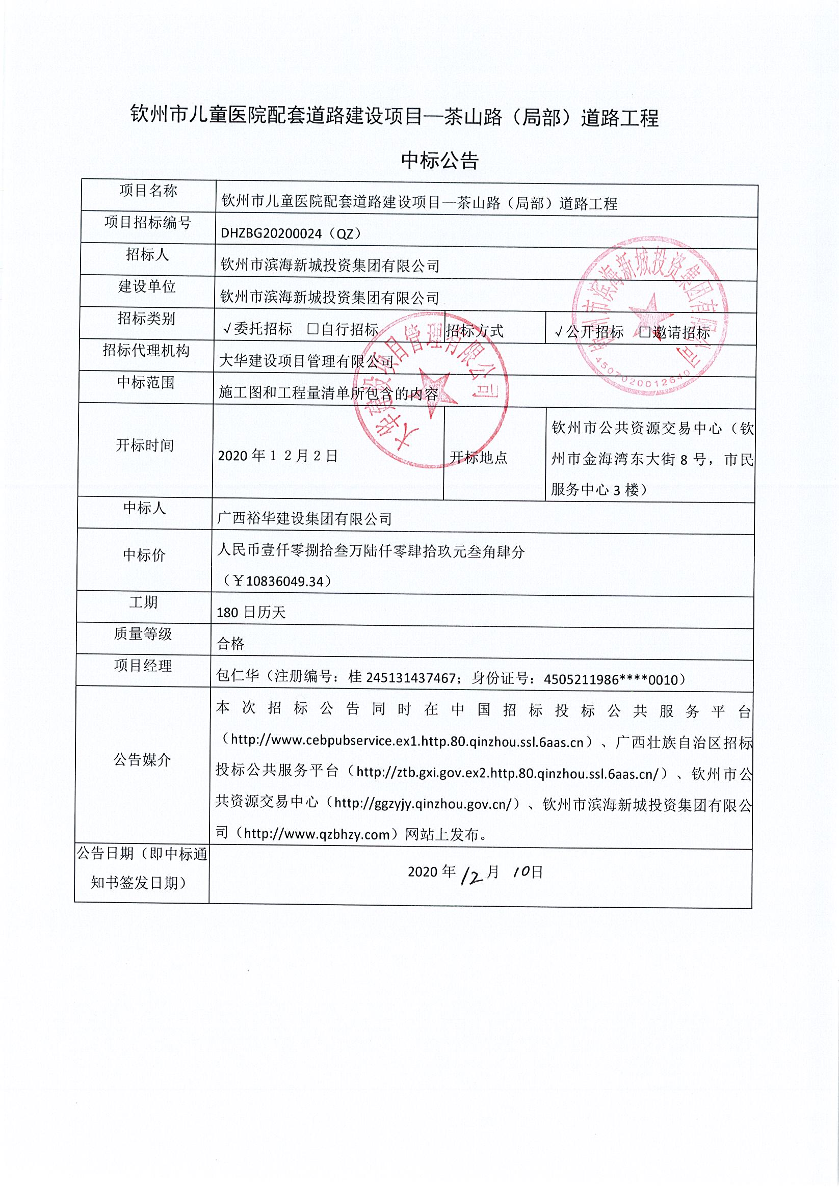 欽州市兒童醫(yī)院配套道路建設(shè)項(xiàng)目-茶山街(局部)道路工程中標(biāo)公告