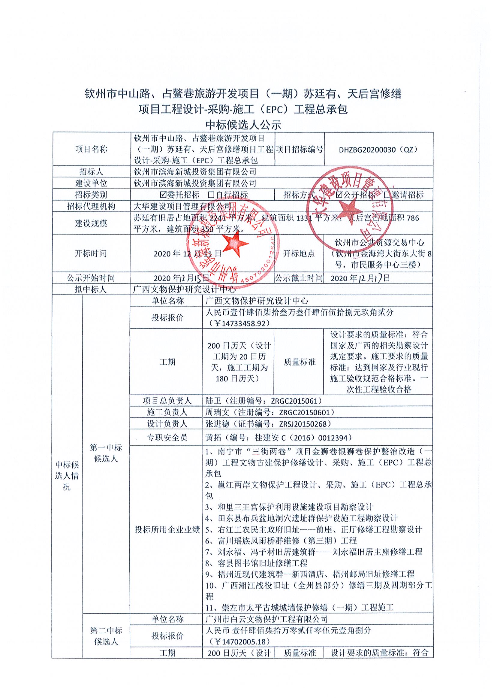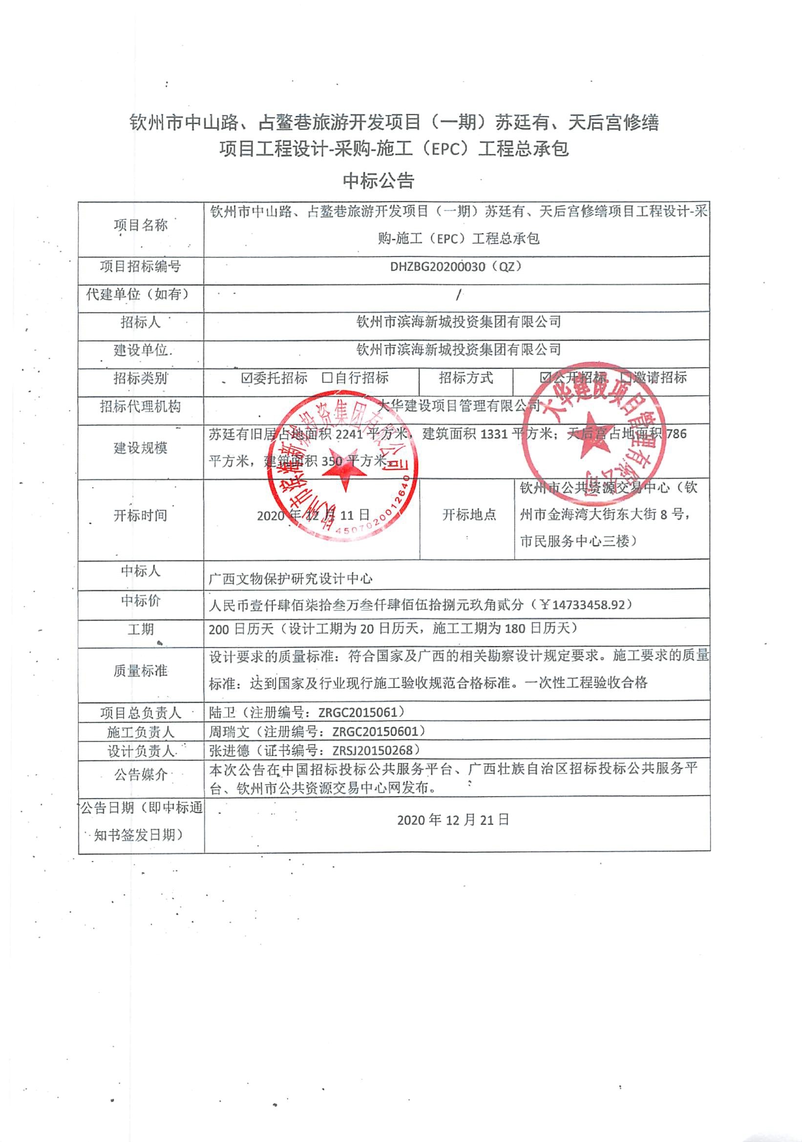 中標(biāo)公示-欽州市中山路、占鰲巷旅游開發(fā)項(xiàng)目(一期)蘇廷有、天后宮修繕項(xiàng)目工程設(shè)計(jì)-采購-施工(EPC)工程總承包中標(biāo)公告