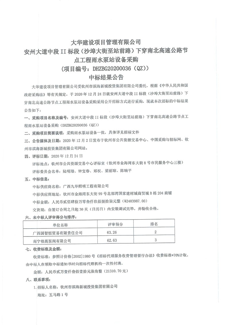 安州大道中段II標(biāo)段(沙埠大街至站前路)下穿南北高速公路節(jié)點(diǎn)工程雨水泵站設(shè)備采購中標(biāo)結(jié)果公告