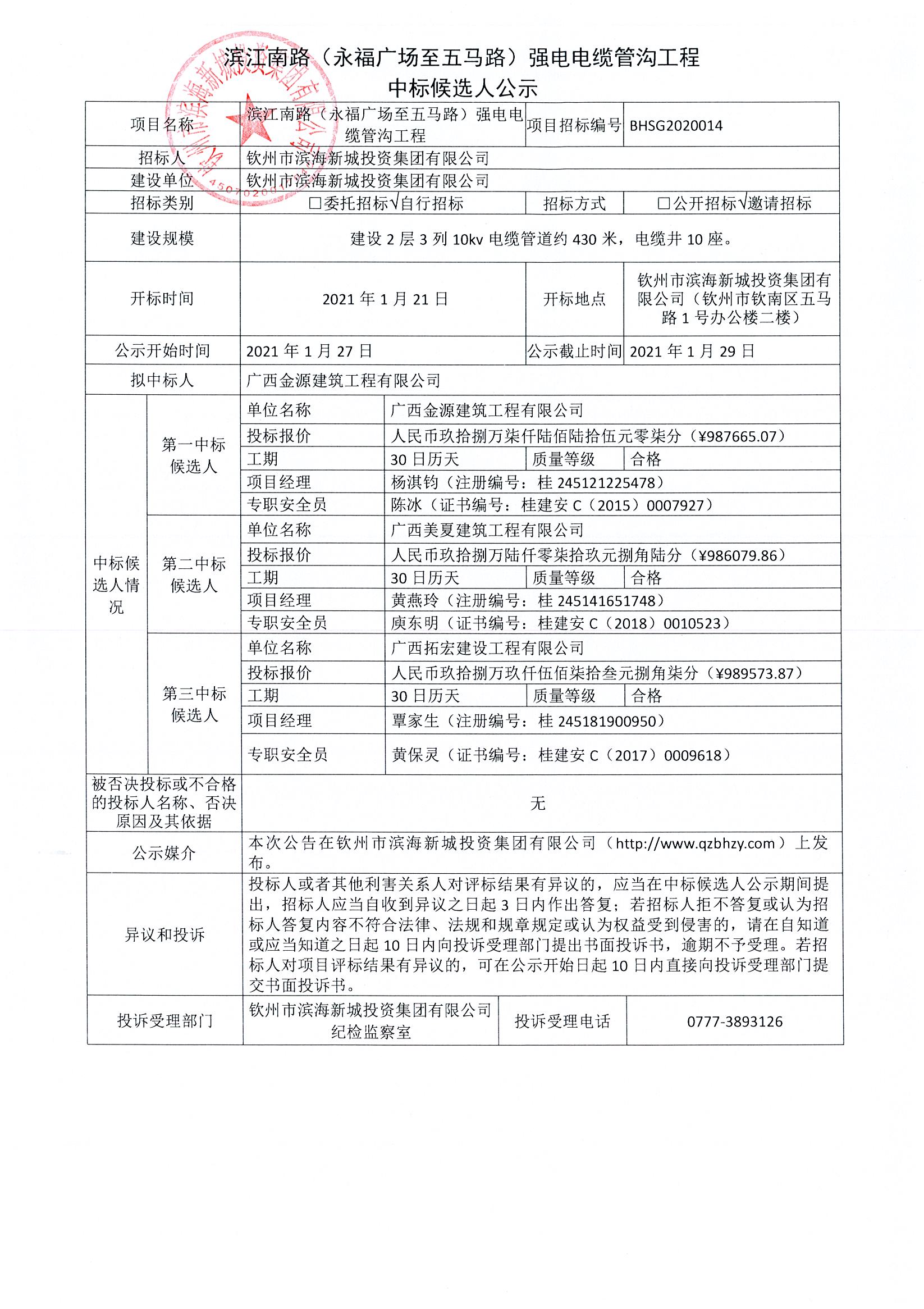 濱江南路(永福廣場至五馬路)強(qiáng)電電纜管溝工程中標(biāo)候選人公示