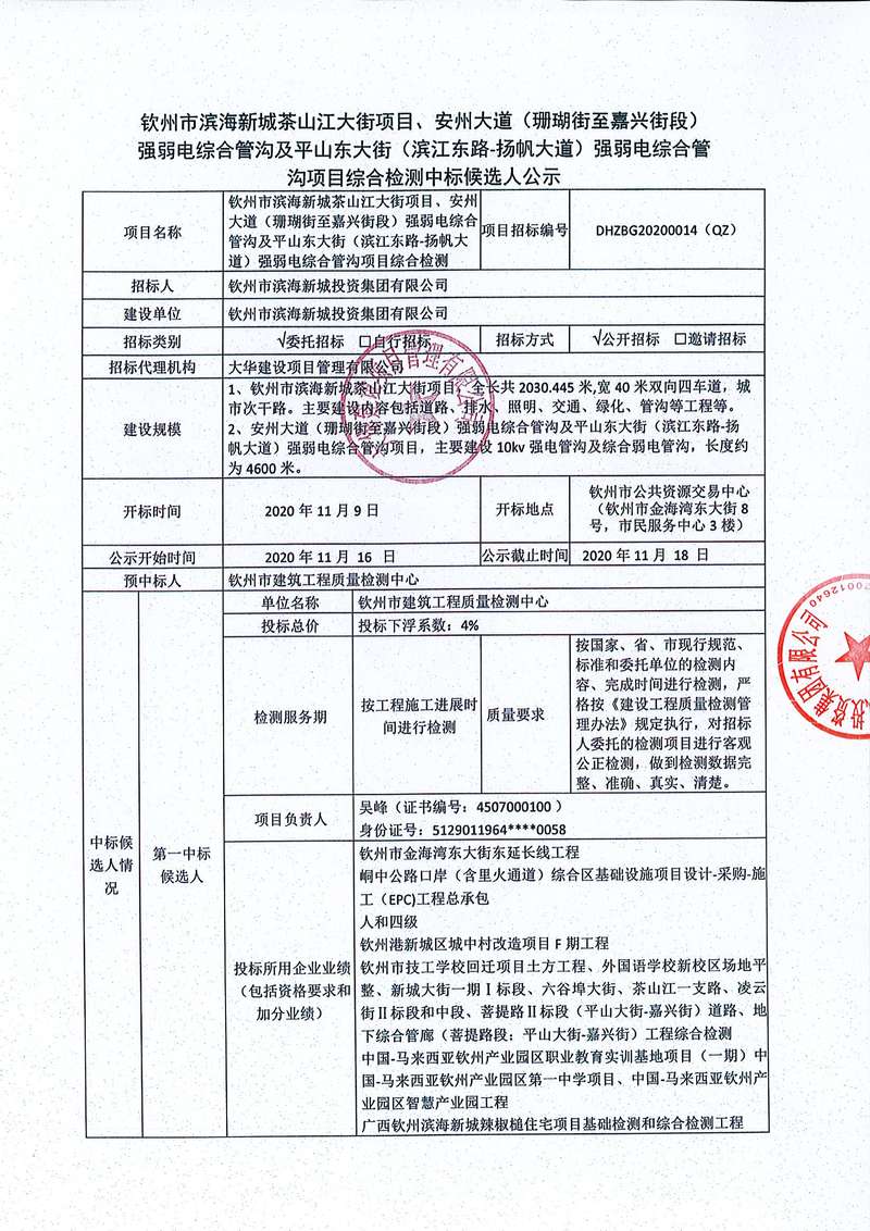 欽州市濱海新城茶山江大街項(xiàng)目、安州大道(珊瑚街至嘉興街段)強(qiáng)弱電綜合管溝及平山東大街(濱江東路-揚(yáng)帆大道)強(qiáng)弱電綜合管溝項(xiàng)目綜合檢測中標(biāo)候選人公示