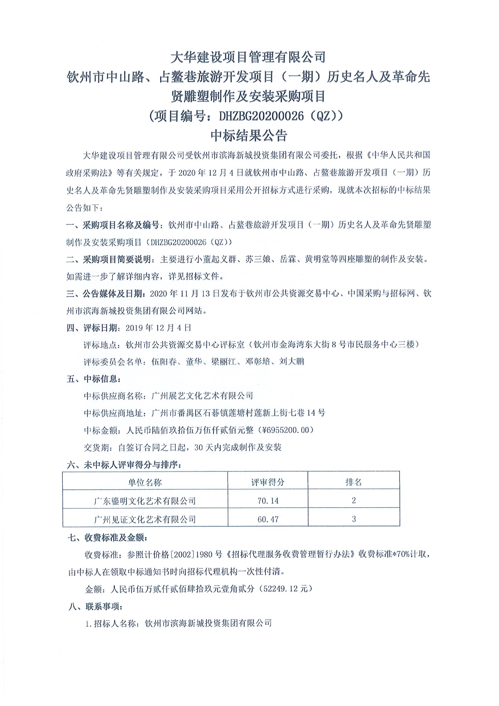 欽州市中山路、占鰲巷旅游開發(fā)項(xiàng)目(一期)歷史名人及革命先賢雕塑制作及安裝采購項(xiàng)目中標(biāo)結(jié)果公告