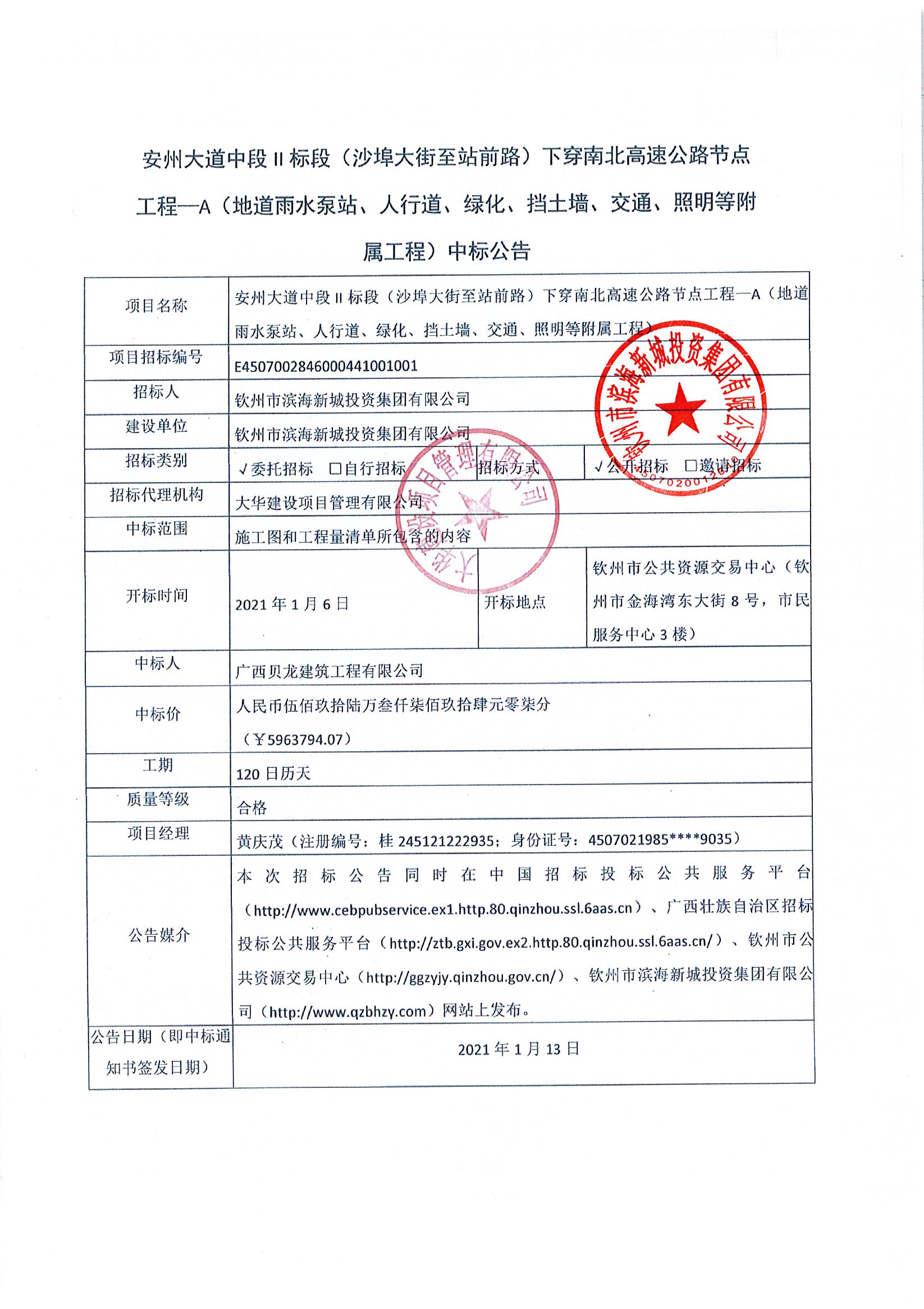 安州大道中段II標(biāo)段(沙埠大街至站前路)下穿南北高速公路節(jié)點(diǎn)工程—A(地道雨水泵站、人行道、綠化、擋土墻、交通、照明等附屬工程)中標(biāo)公告