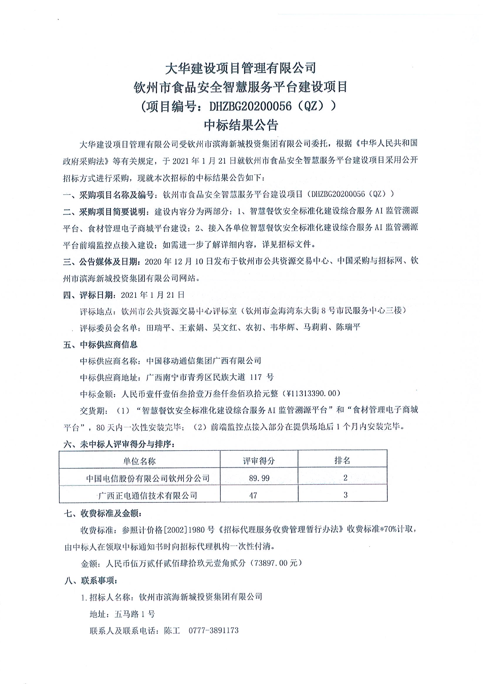 欽州市食品安全智慧服務(wù)平臺建設(shè)項(xiàng)目中標(biāo)結(jié)果公告