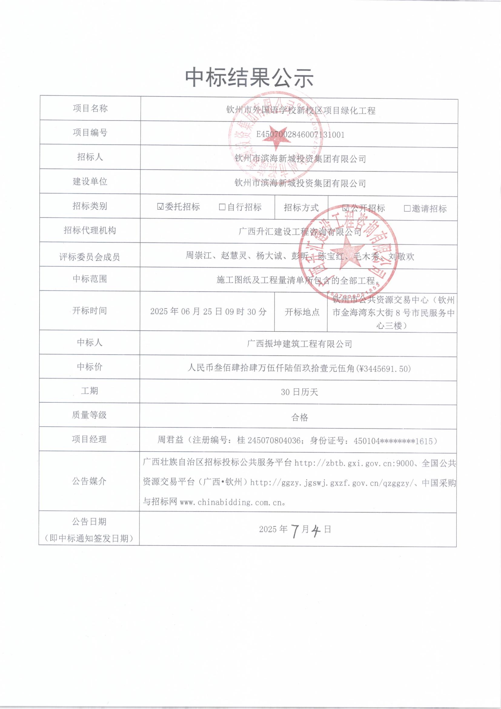 成交結(jié)果公告(欽州市外國(guó)語(yǔ)學(xué)校新校區(qū)項(xiàng)目材料暫估價(jià))