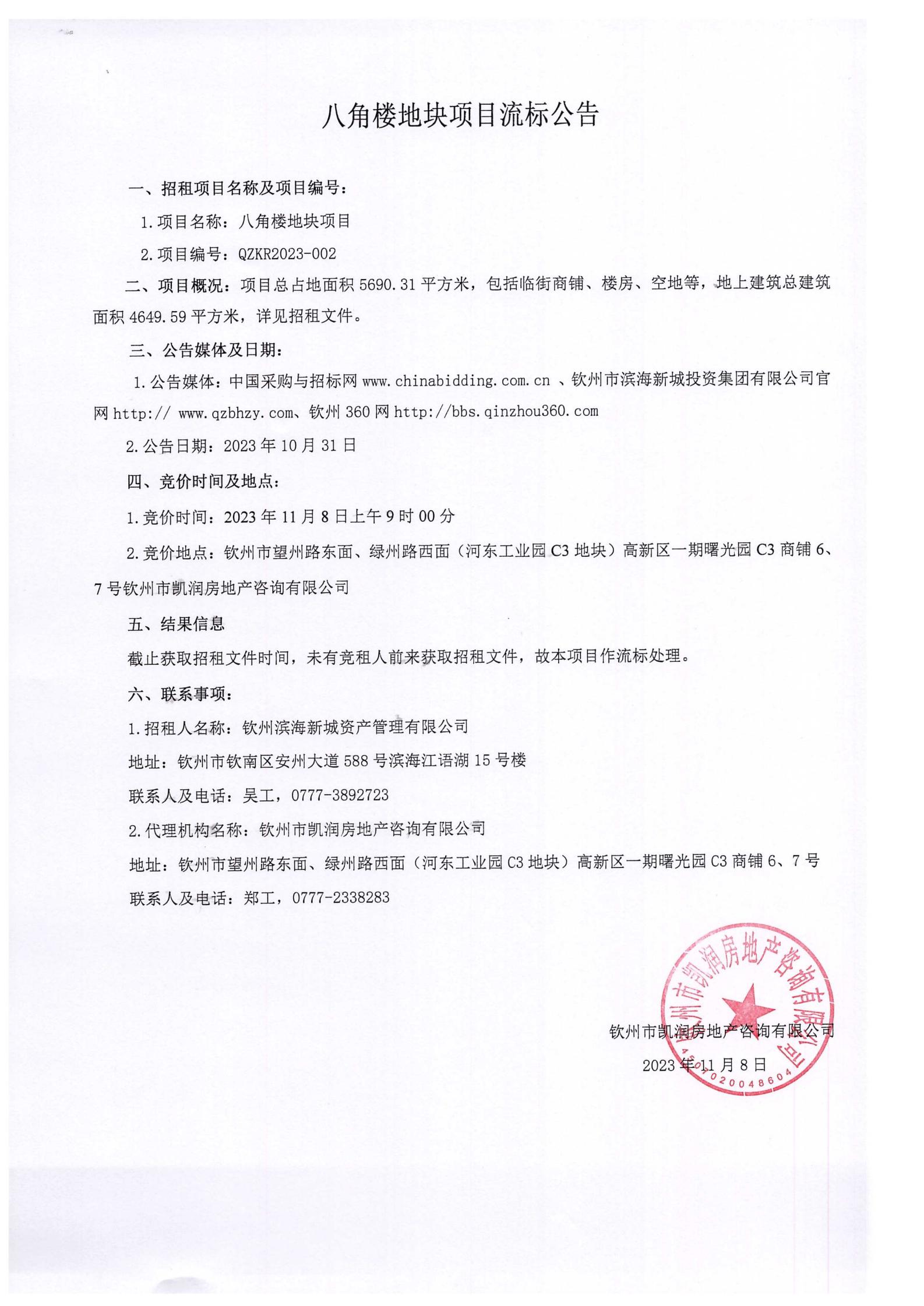 欽南區(qū)尖山街道辦九鴉村委國有收儲土地(蝦塘)部分出租(QZKR2023-008)流標公告