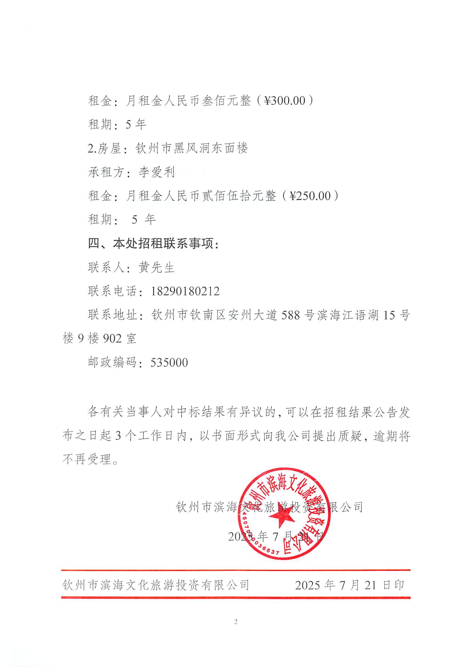 欽州市濱海文化旅游投資有限公司關(guān)于欽州市老街范圍2處房屋公開招租結(jié)果公示