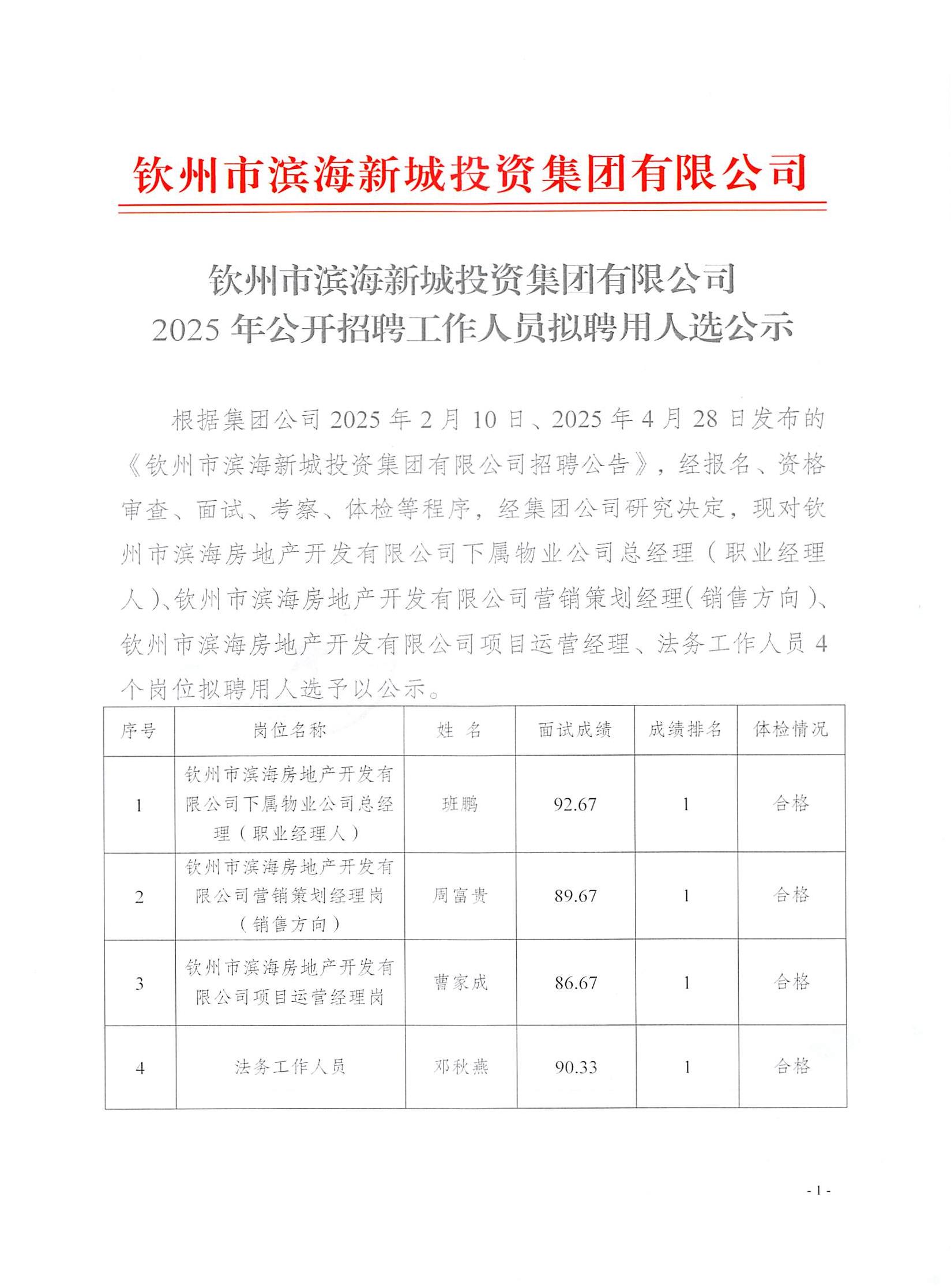 欽州市濱海新城投資集團有限公司2025年公開招聘工作人員擬聘用人選公示