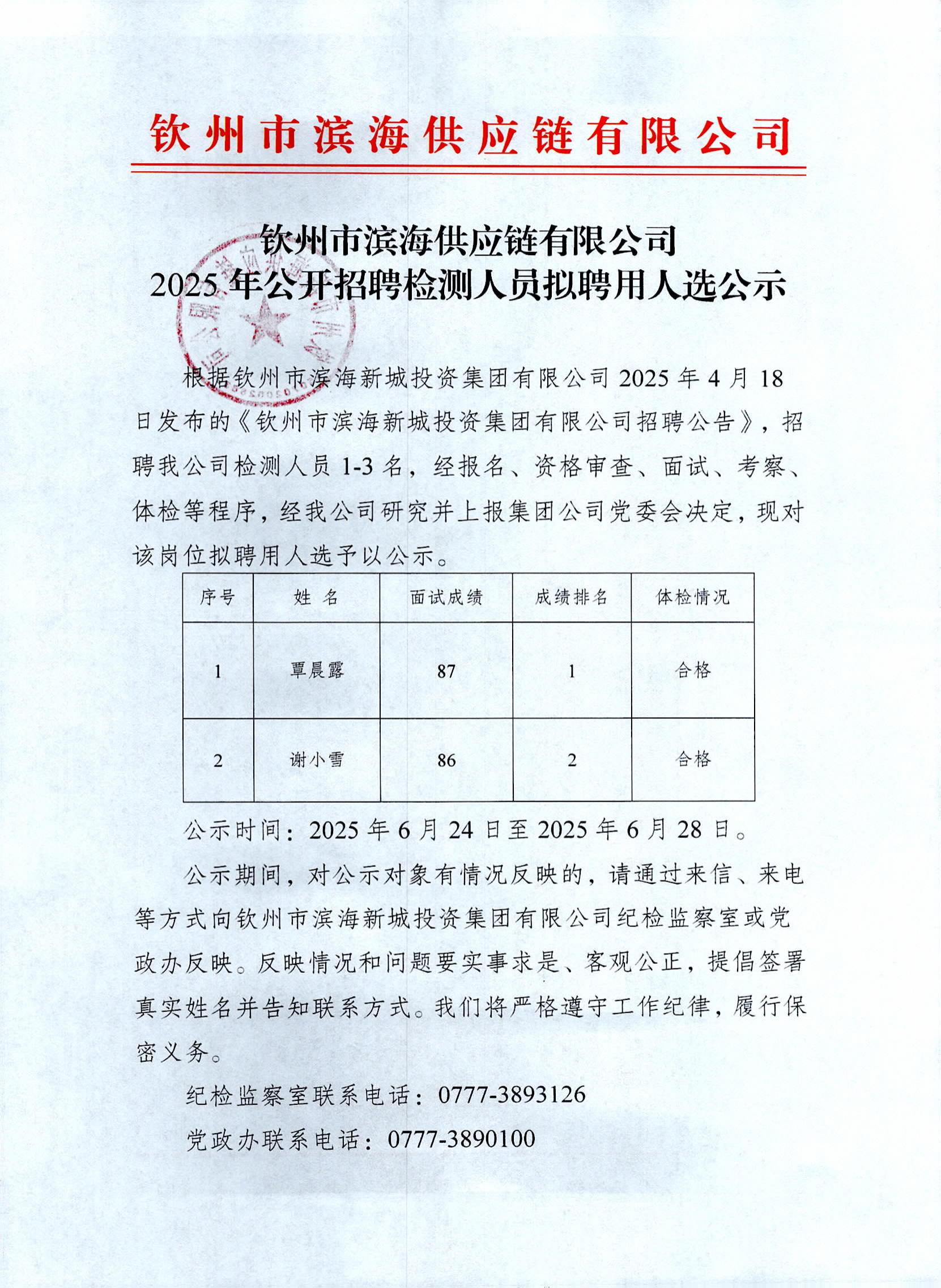 欽州市濱海供應鏈有限公司2025 年公開招聘檢測人員擬聘用人選公示