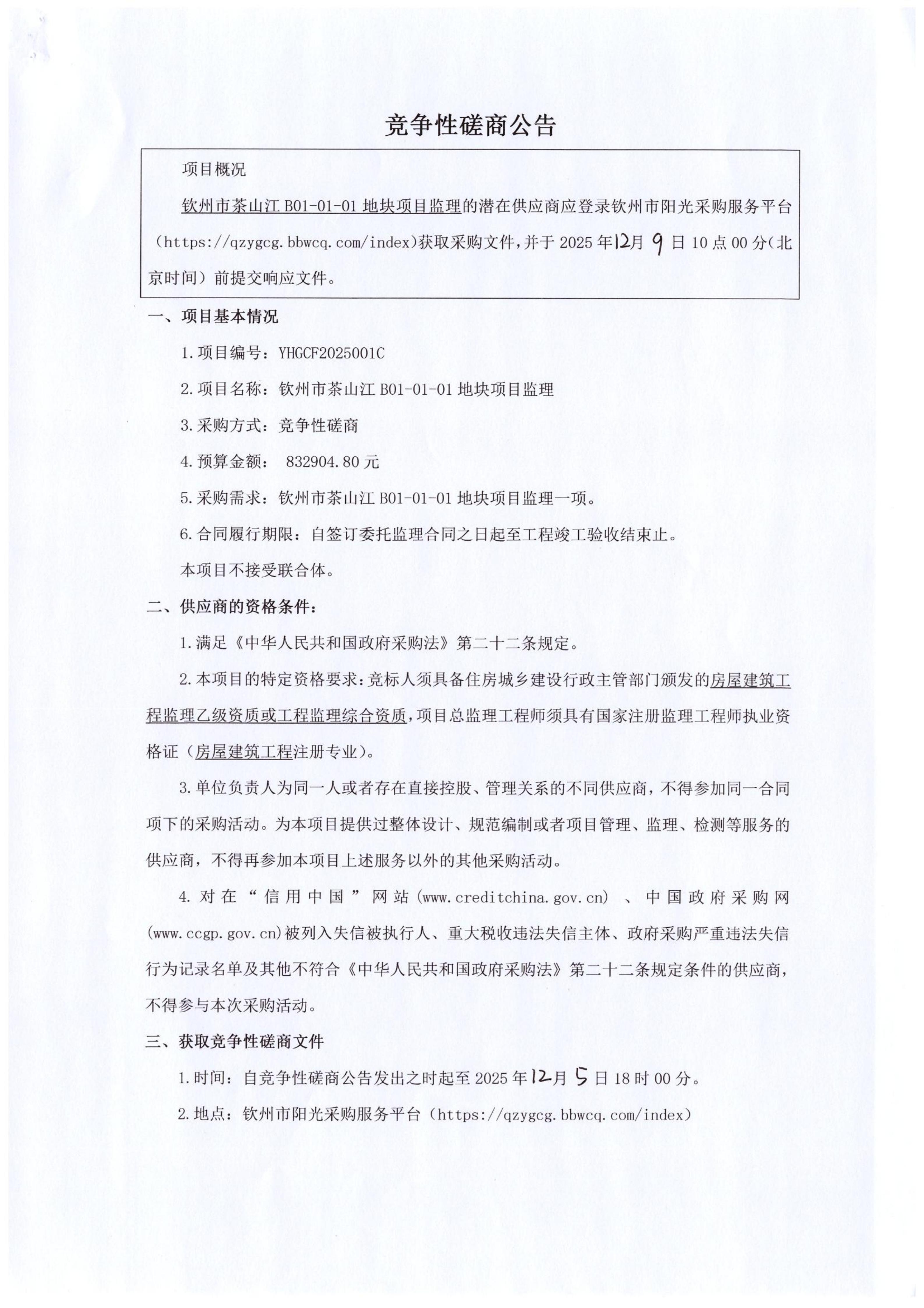 茶山江B01-01-01項(xiàng)目監(jiān)理競(jìng)爭(zhēng)性磋商公告