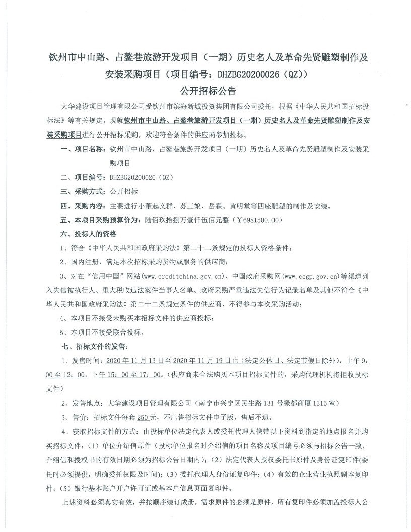 欽州市中山路、占鰲巷旅游開發(fā)項(xiàng)目(一期)歷史名人及革命先賢雕塑制作及安裝采購項(xiàng)目公開招標(biāo)公告