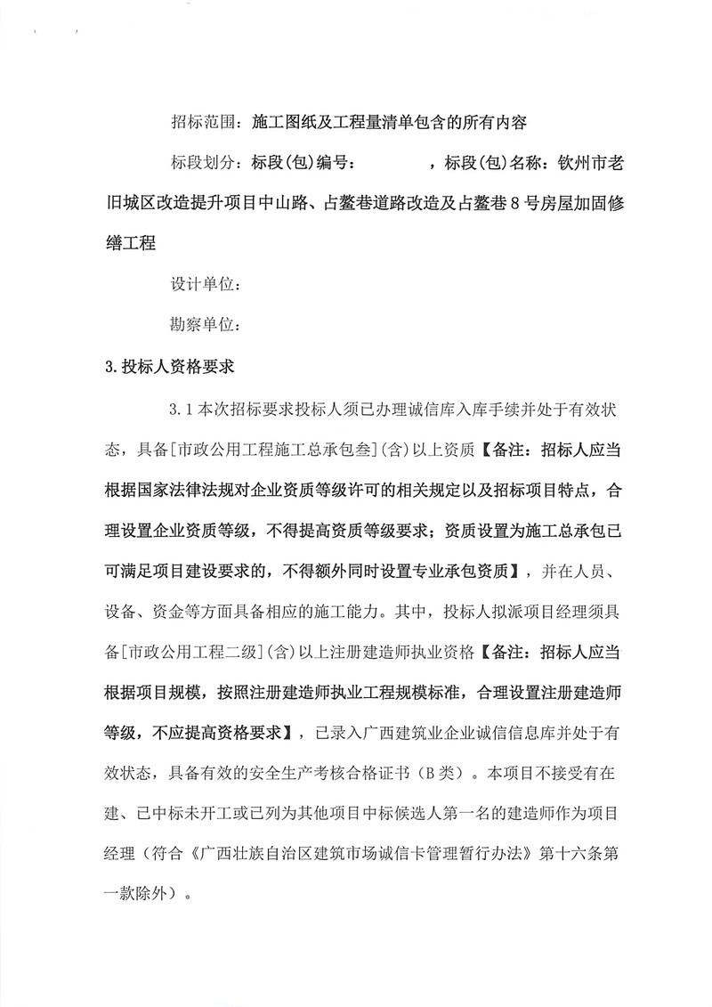 欽州市老舊城區(qū)改造提升項(xiàng)目中山路、占鰲巷道路改造及占鰲巷8號房屋加固修繕工程