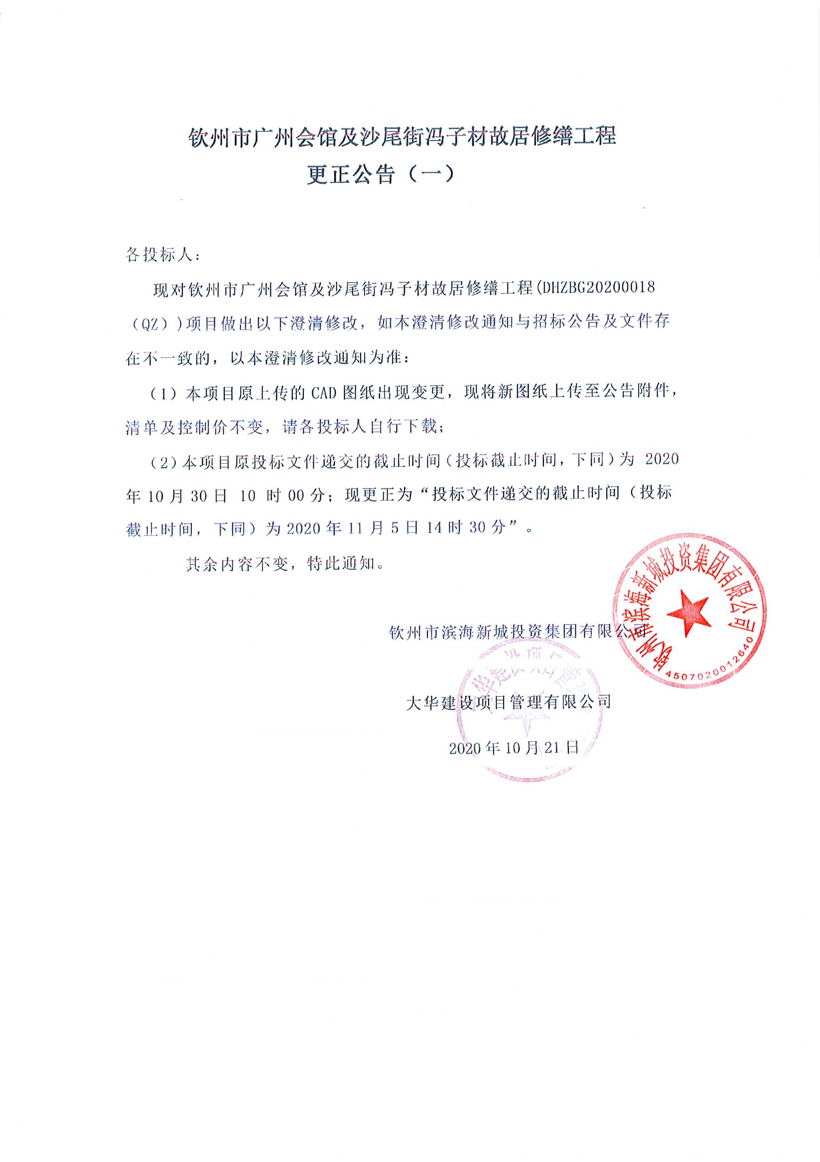 欽州市廣州會館及沙尾街馮子材故居修繕工程更正公告(一)