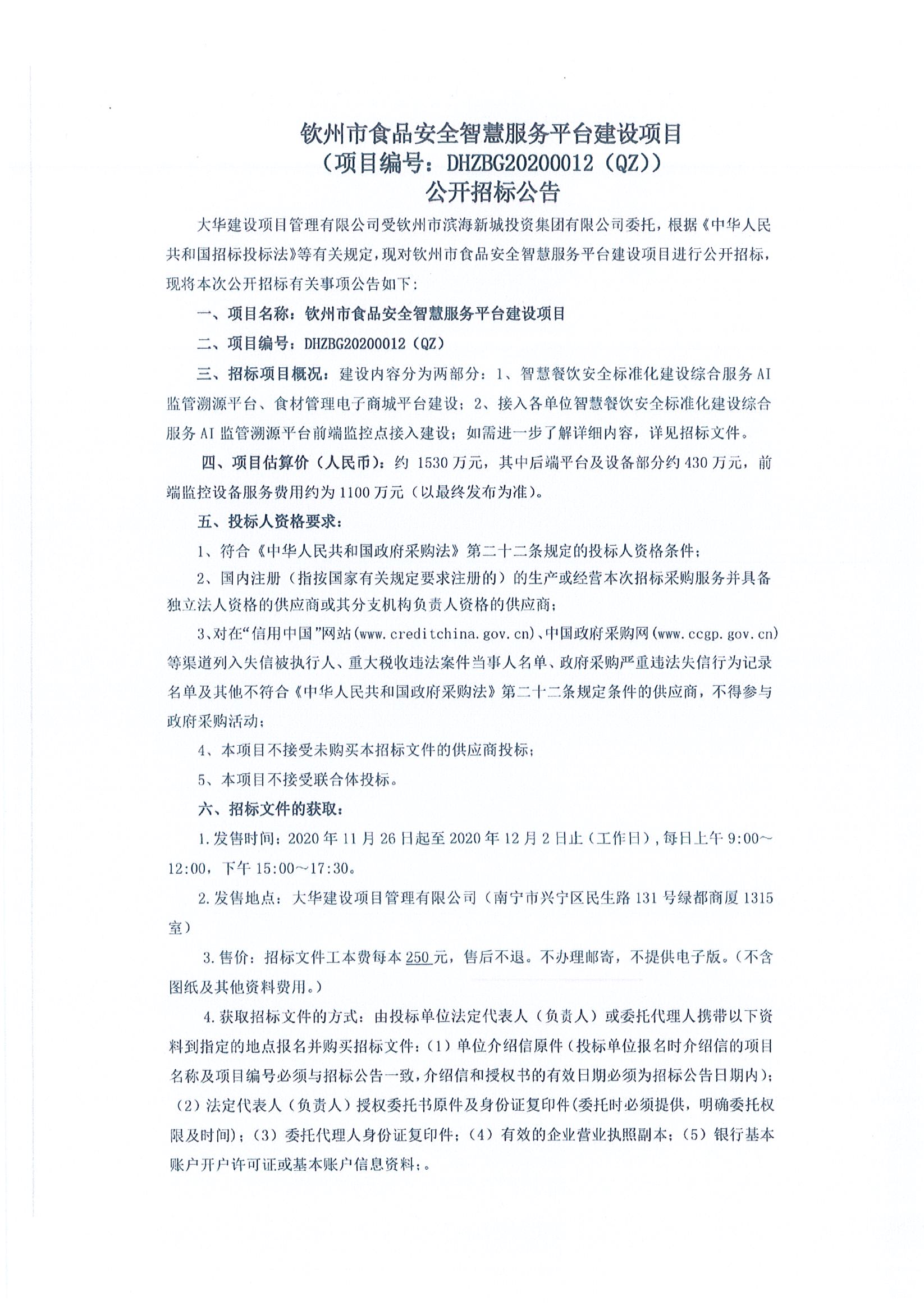 欽州市食品安全智慧服務(wù)平臺建設(shè)項(xiàng)目公開招標(biāo)公告